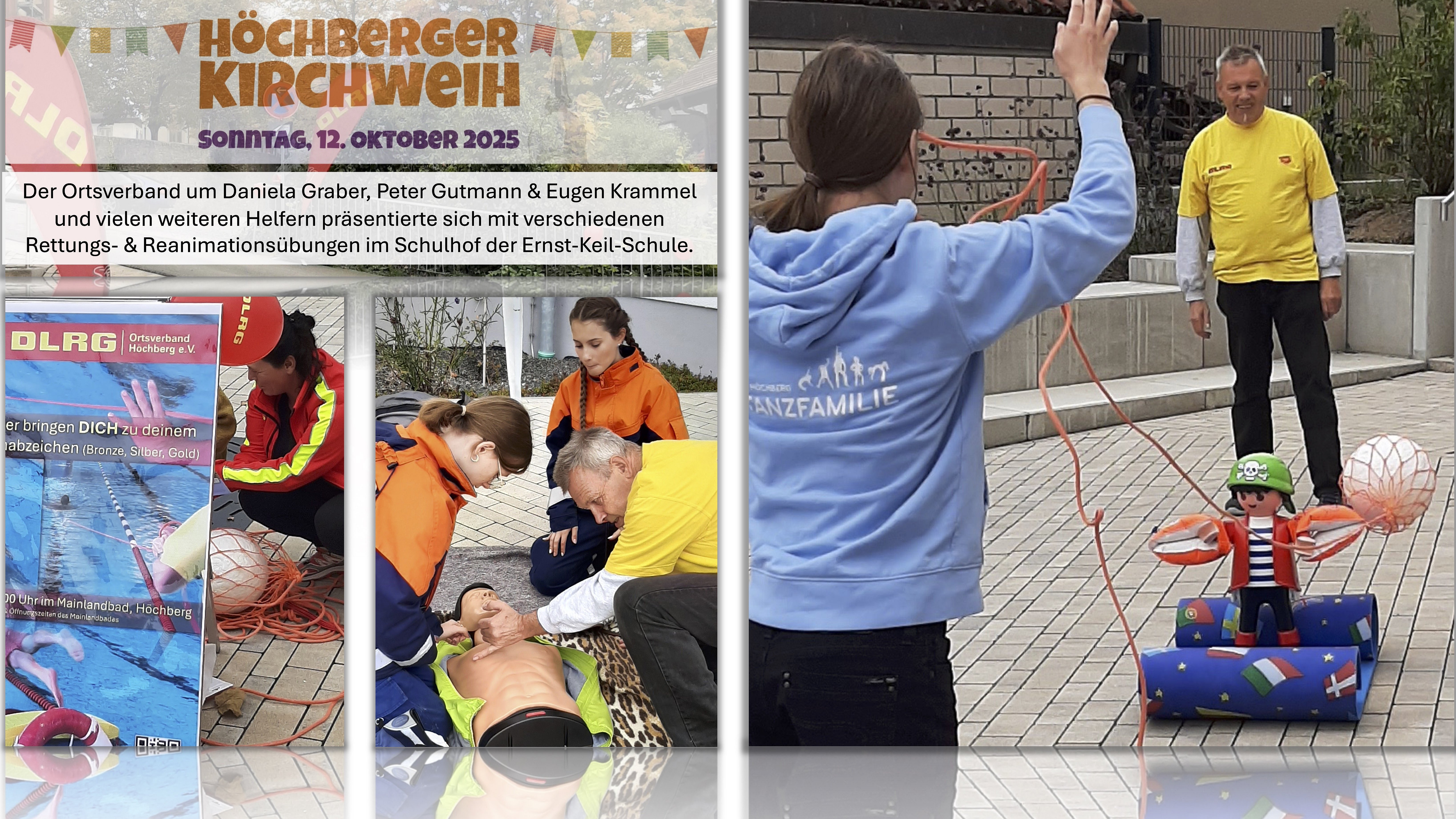 Am Kirchweihsonntag war der DLRG OV Höchberg mit einem Info-Stand vertreten. Unser Ausbilder Peter Gutmann demonstrierte an der Übungspuppe die Wiederbelebung, die viel Interesse bei Jung & Alt fand und zum Ausprobieren einlud. Zudem hatte unsere 2. Vorsitzende Daniela Graber eine Playmobil-Figur in Kindergröße aufgestellt, so dass die Kids das Zielwerfen mit dem Rettungsball an der Leine testen konnten. Wer traf wurde mit einem Stück Kuchen (in Form von Rettungsringen) belohnt. Außerdem hatte Daniela eine Malecke mit Ausmalvordrucken und Buntstiften vorbereitet. An die kleineren Besucher verteilte der 1. Vorsitzende Eugen Krammel Luftballone, Fähnchen und Baderegel-Flyer. Für die größeren Besucher wurden unter anderem auch von unserem Ersthelfer Norbert Placzek Einkaufswagenchips mit Flaschenöffner verteilt. Außerdem konnten wir viele Fragen zum Thema Rettungsschwimmer-Ausbildung beantworten. Wir hoffen, dass etliche von den Interessenten den Weg zu uns finden.